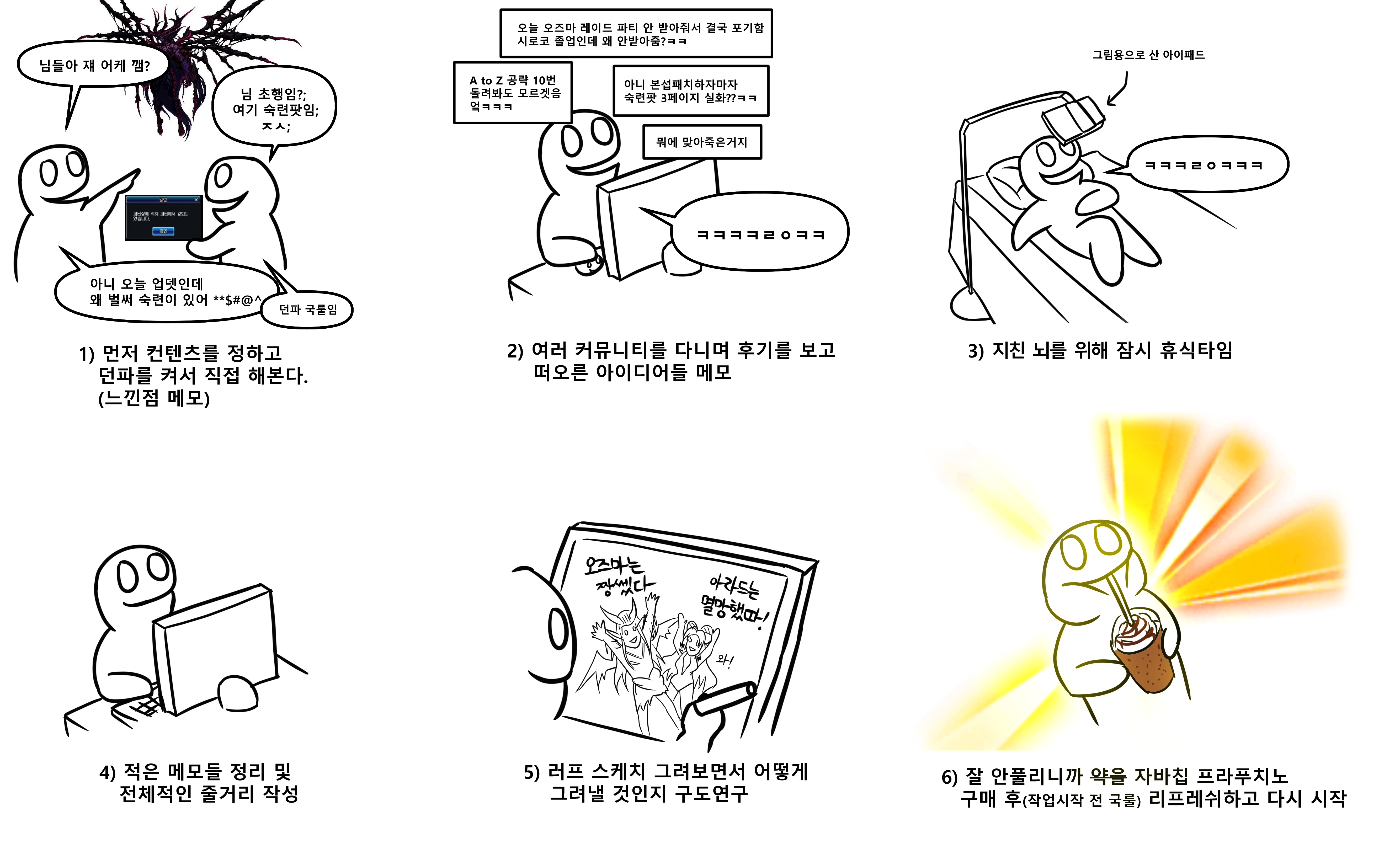 여러 커뮤니티를 둘러보거나 게임에 접속해서 컨텐츠를 직접 즐겨보면서 이거다 싶은 게 떠오르면 메모하여 제작합니다.