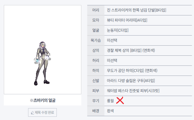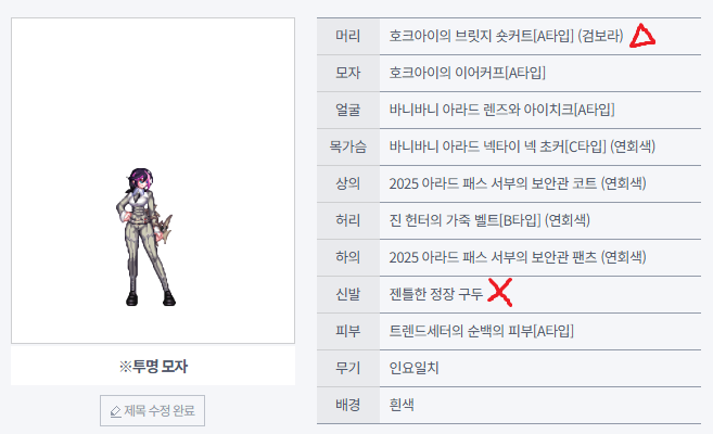 X표시한 부위는 현재 구할 수 없는 아바타입니다. 다만 아처 신발은 유가영의 신발 등으로 일단 대용 가능할 것 같습니다.