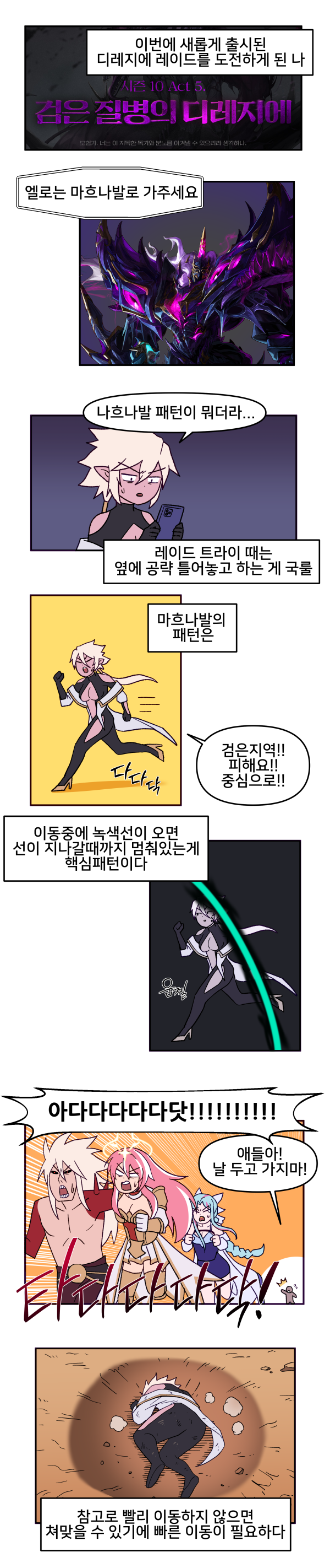 제가 이번 디레지에 레이드에서 8시간동안 트라이하면서 경험한 경험담들을 만화로 그려봤습니다.