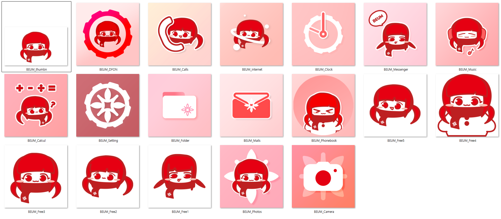 썸네일 제외 전체 18개 항목으로 이루어진 스마트폰용 커스텀 아이콘 팩입니다.