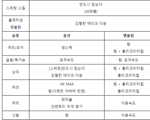저는 허리 회피율 옵션 + 상하의 회피율 엠블을 쓰려고 사두긴 했는데... 엠블이 탈부착이 안되다보니 찬크리 박힌거에 회피율 박아넣는게 쉽진않네요