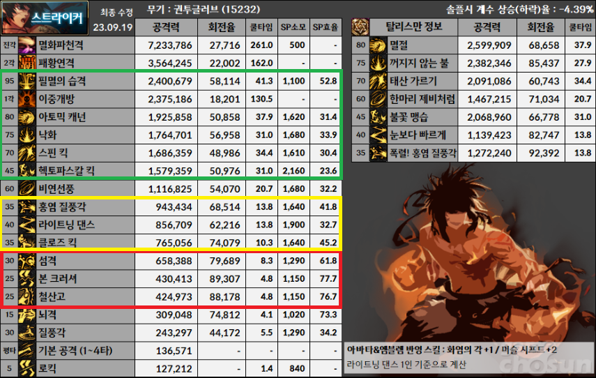 35제 스킬의 딜비중이 굉장히 높아져서 왠만하면 비연선풍, 스핀킥 개화보다는 클킥1 홍염질풍각 2를 사용해주는게 좋습니다