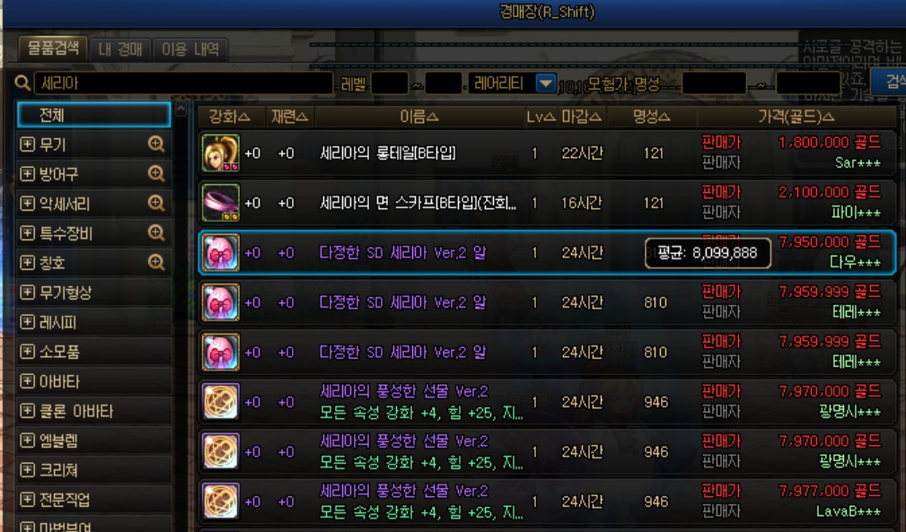 때문에 세라샵 또는 경매장에서 판매하는 '세리아'가 붙은 준종결 세팅을 권해드립니다.