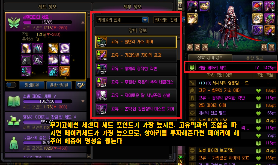 이런식으로 그때그때 명성과, 가장 세트포인트가 높은 장비를 고려해 장비를 바꿔가며 플레이 하면 됩니다