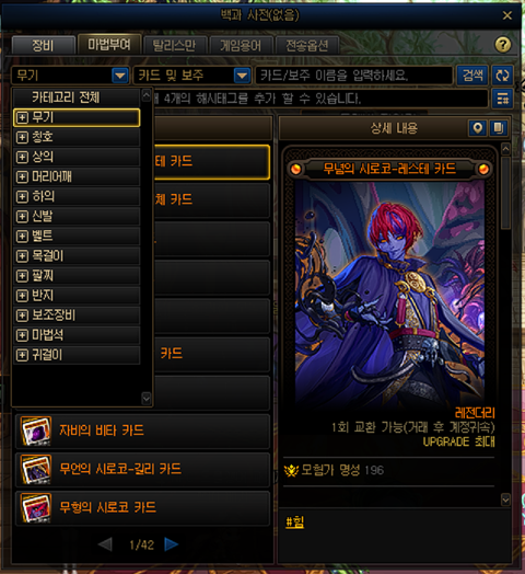 백과 사전에 마법부여 탭으로 가면 각 카테고리별로 마법부여 카드를 확인할 수 있습니다.
