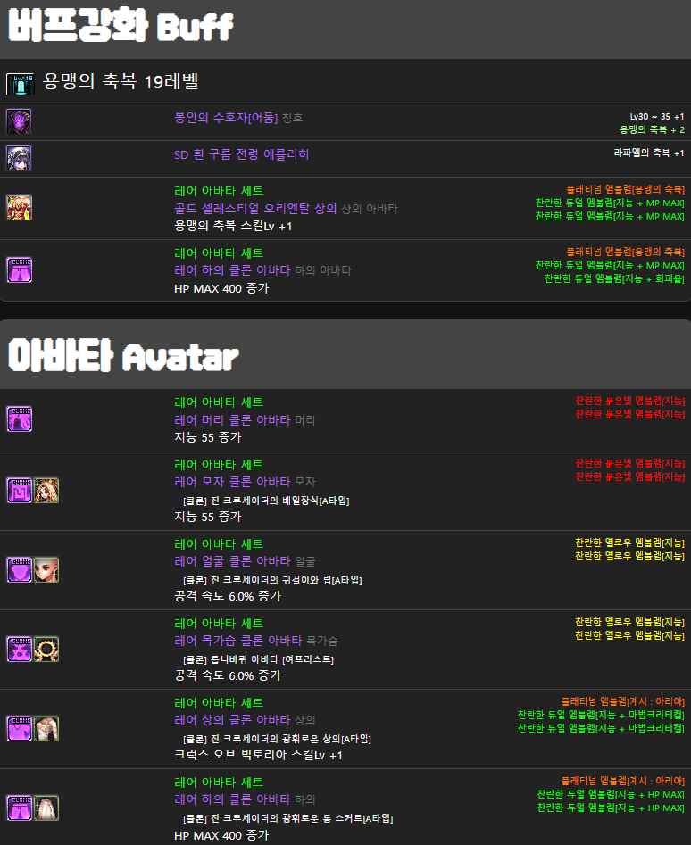 버프 스위칭 박스에 +3칭호 / 종결 크리쳐(에를리히) / 용맹의 축복 플래티넘이 있는 용맹의 축복 상의 / 용맹의 축복 플래티넘이 있는 하의 가 있어야 합니다.