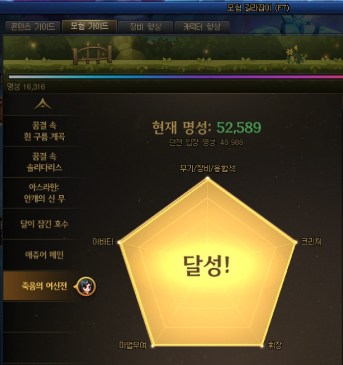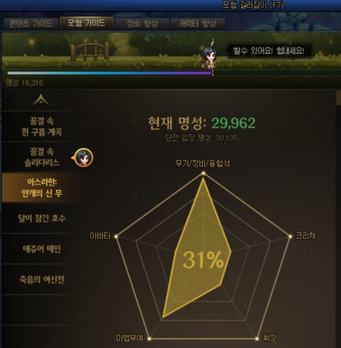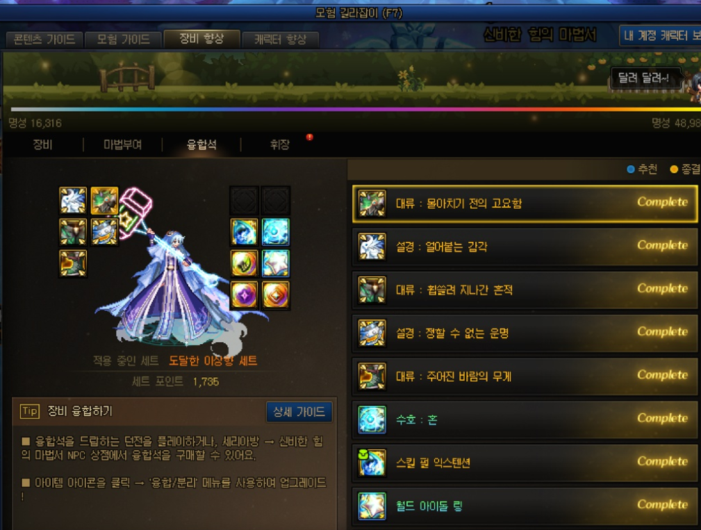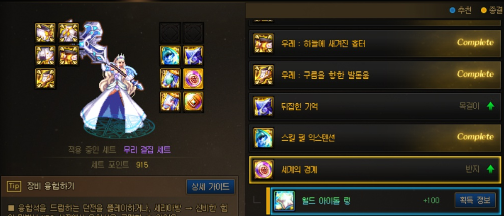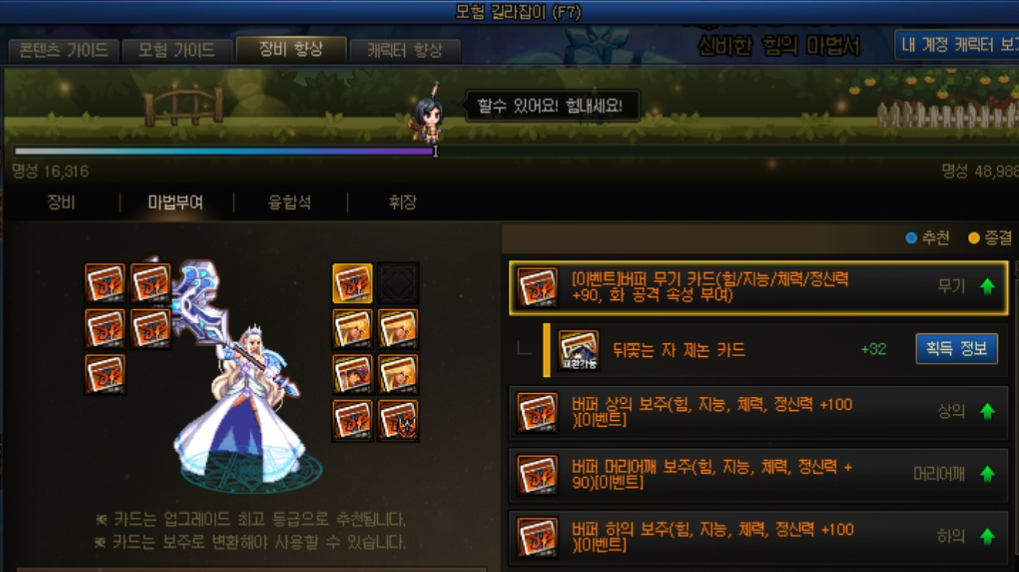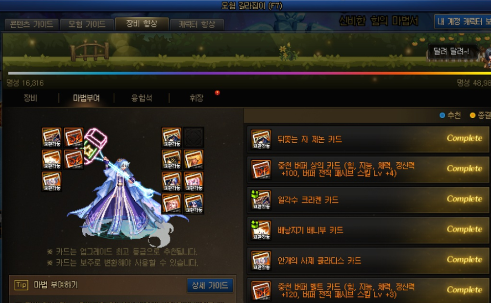뭐가 부족한지 궁금하실 때엔 '길라잡이'를 이용해 필요한 마법부여등을 확인하실 수 있습니다.