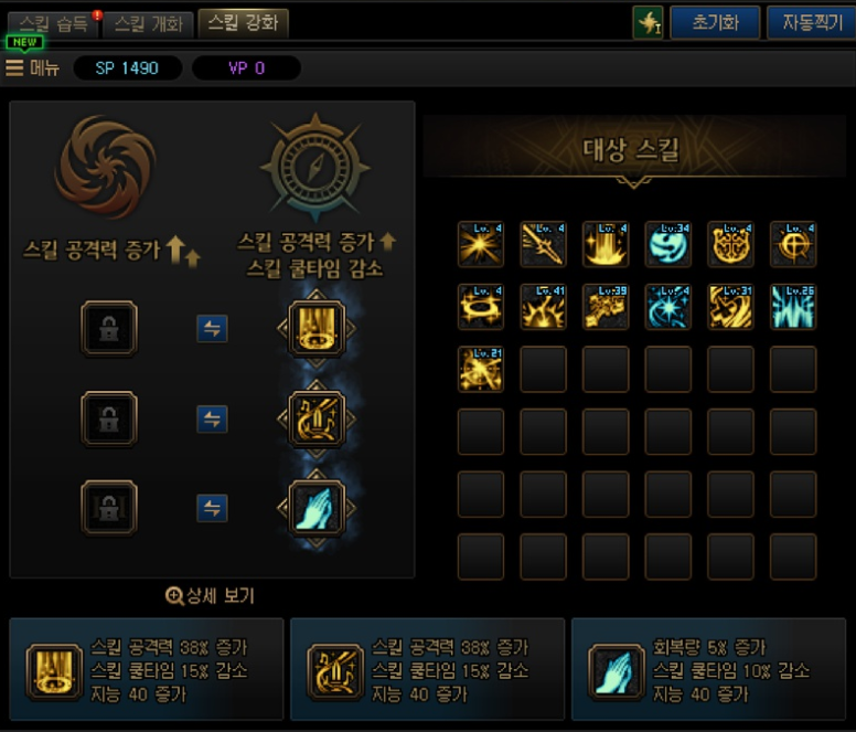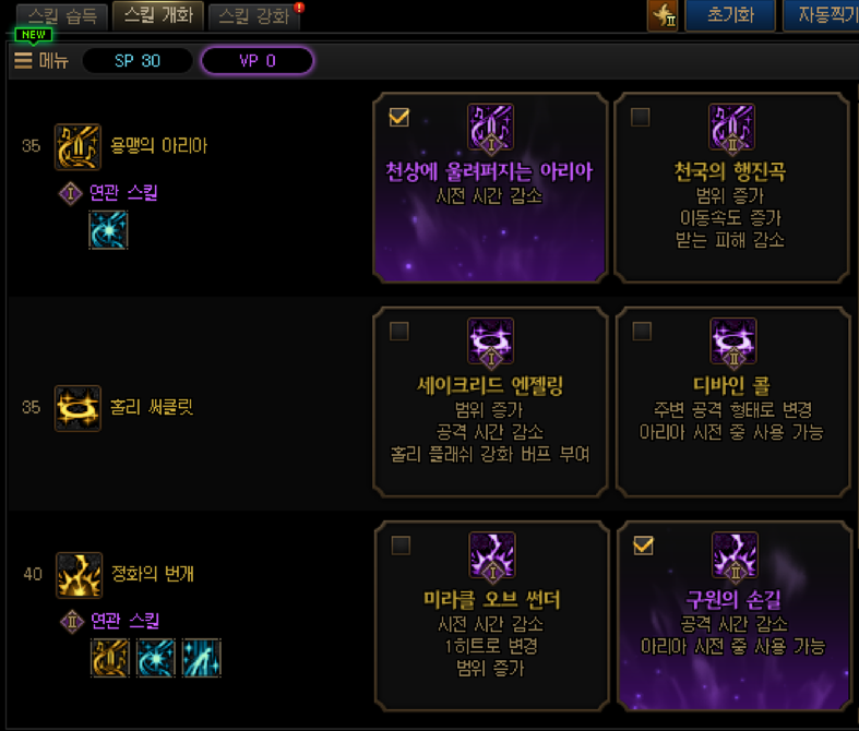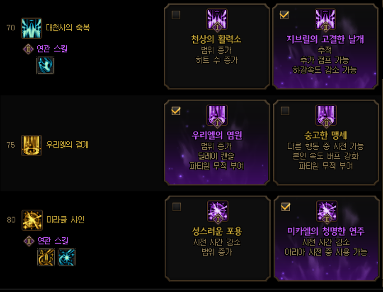 스킬 강화는 제가 제일 좋아하는 스킬인 우리엘과 중요한 스킬인 아리아 그리고 치유의 기도를 선택했습니다. 솔플시 치유의 기도를 빼고 다른 스킬을 넣으시면 됩니다.