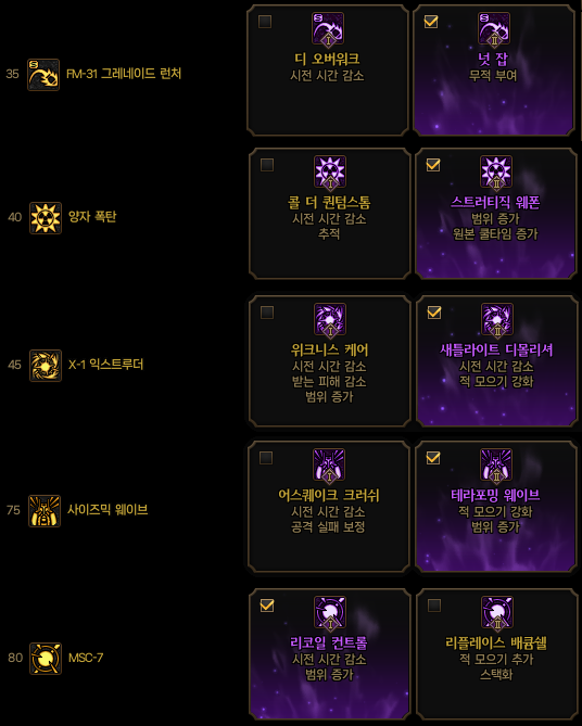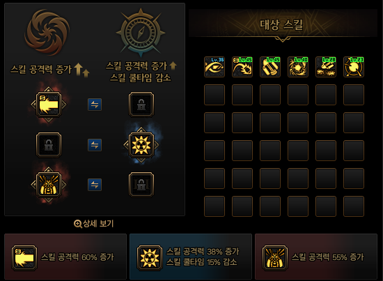 레어등급의 경우 본인의 취향에 맞는 스킬을 골라서 강화하시면 됩니다. (40/45/60/70/75/80)
