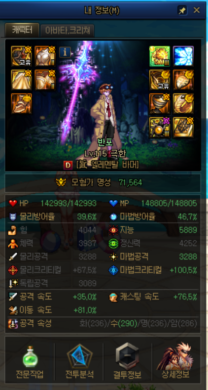 상/하의엔 본인 마법크리티컬에 따라 지능+마법크리티컬or마법크리티컬 추천드립니다