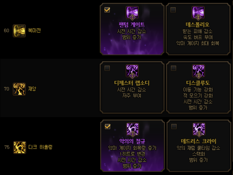 2. 버프스킬쓰는순서 추락하는영혼 ->고통의희열 -> 메타몰포시스 -> 악마화 이렇게 합니다 다들 아시는 팁이겠지만 악마화하기전에 '재앙' 스킬쓰면서 악마화를 하면 변신하는순간 한정해서 재앙의 범위가 맵전체로 적용됩니다