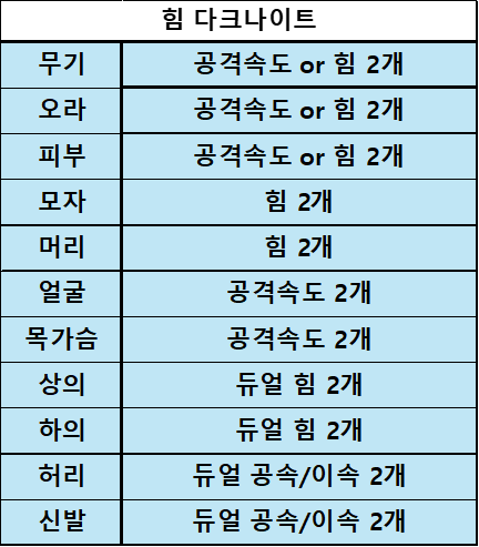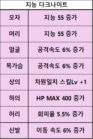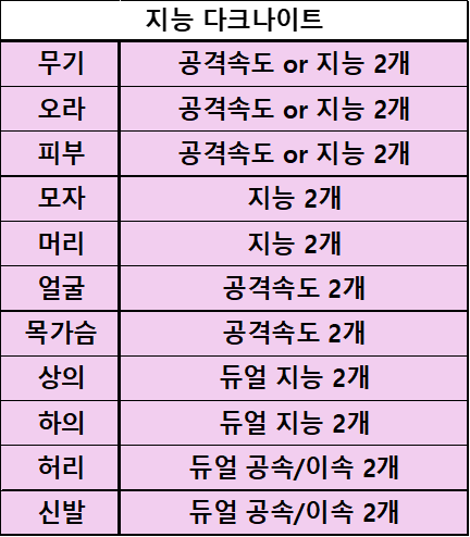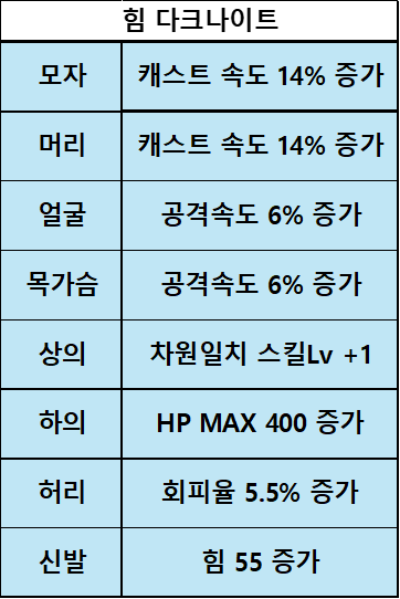 힘 다크나이트의 모자 머리 옵션인 캐스트 속도는 영향 받는 스킬이 다크 플레임 소드 정도라 교불클의 경우 지능 옵션을 사용하셔도 됩니다.