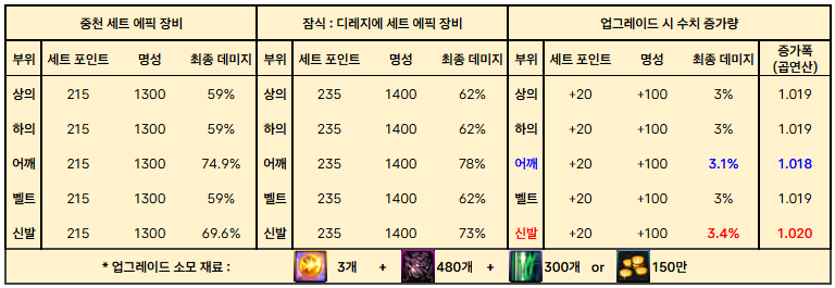 업그레이드 순서는 신발 -> 상의하의벨트 -> 어깨 순서대로 올리시면 됩니다.