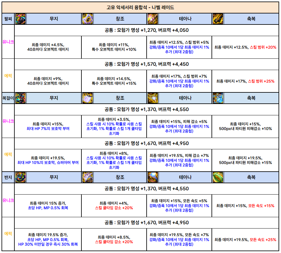 나벨 고유 융합석 : 하술할 표를 보고 본인의 아이템 세팅에 맞게 파밍하시면 됩니다.