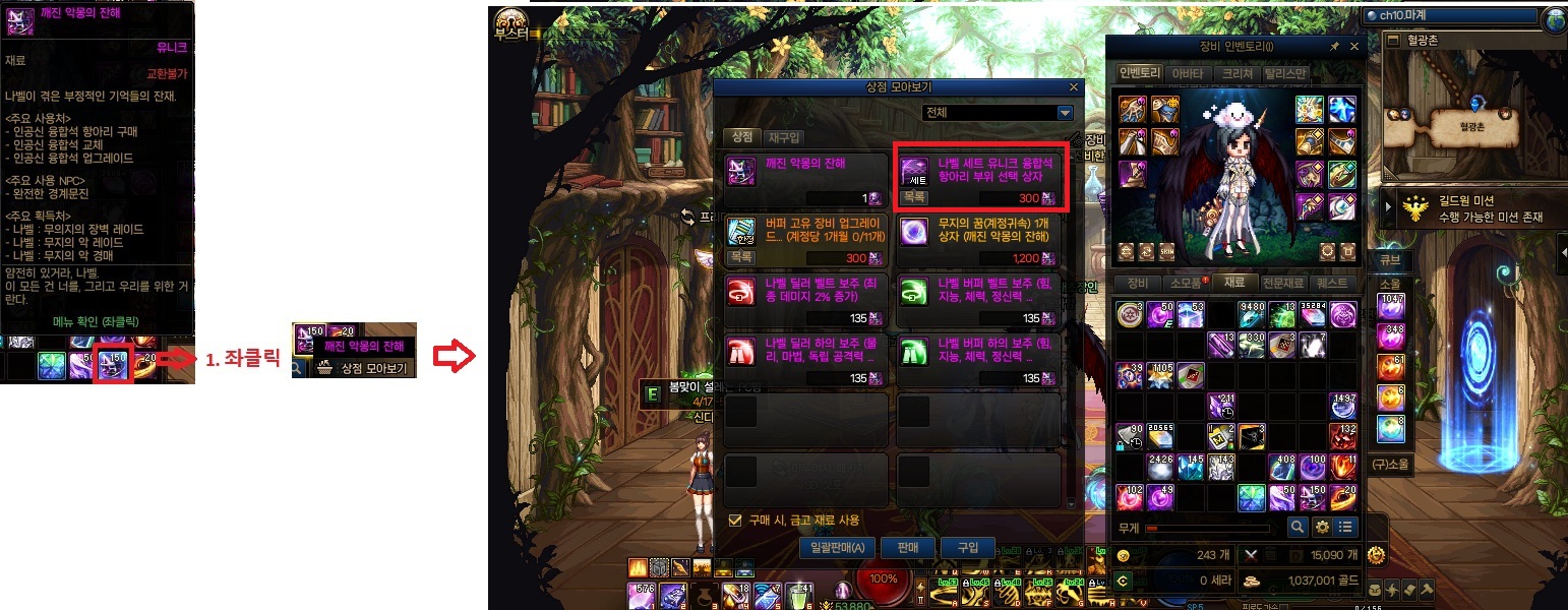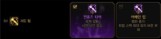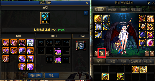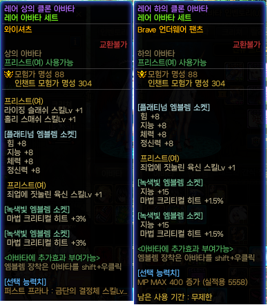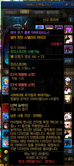 우선 버프강화 입니다. 버프강화용 아바타(레어 상의 하의)에 끼워서 버프강화 슬롯에 넣으시면됩니다.