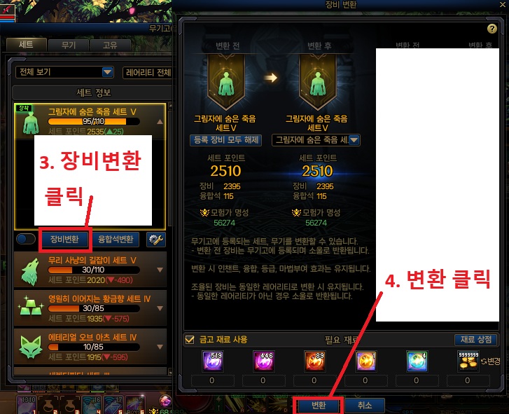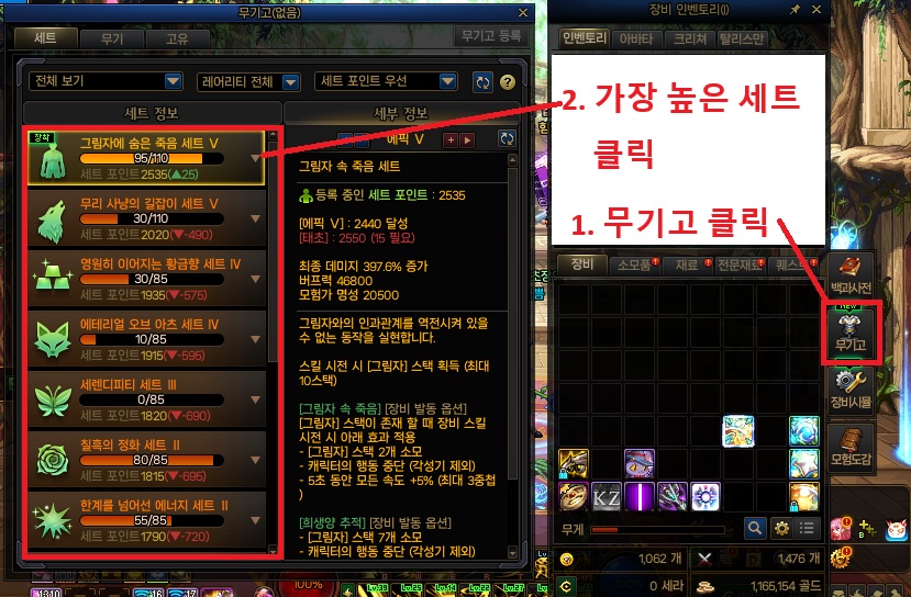 우선 아이템 창에 무기고를 들어가서, 가장높은 세트를 선택하고 장비변환을 하면 됩니다.