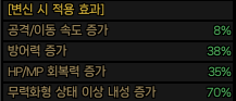 변신 시 무려 공이속 증가, 방어력 증가(어차피 한방에 디짐), HP/MP 회복력 증가(어차피 한방에 디짐), 상태이상내성증가(어차피 한방에 디짐)가 공짜랍니다.