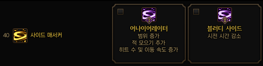 어나이어레이터 : 사이드매서커 시전 중 이동속도가 증가하고, 스킬 범위가 증가하고 조금 더 많이 뺑글뻉글 돕니다.