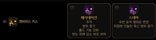 스네어 : 엔비어스 키스가 방사형으로 변경됩니다. 피니쉬 어택시 무적기능은 여전히 있습니다. 죄업에 짓눌린 육신(보라색 테두리) 범위가 증가합니다.