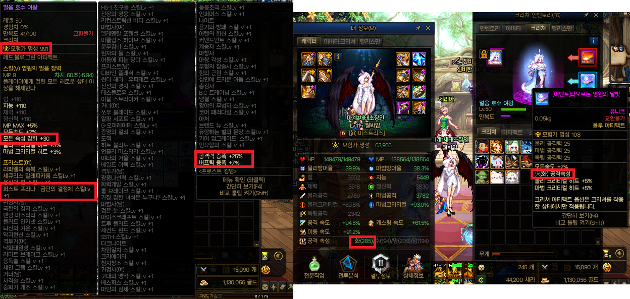 명성 991짜리는 모든속성강화 30, 퍼스트 프라나 +1LV, 공격력증폭 25%를 올려줍니다.