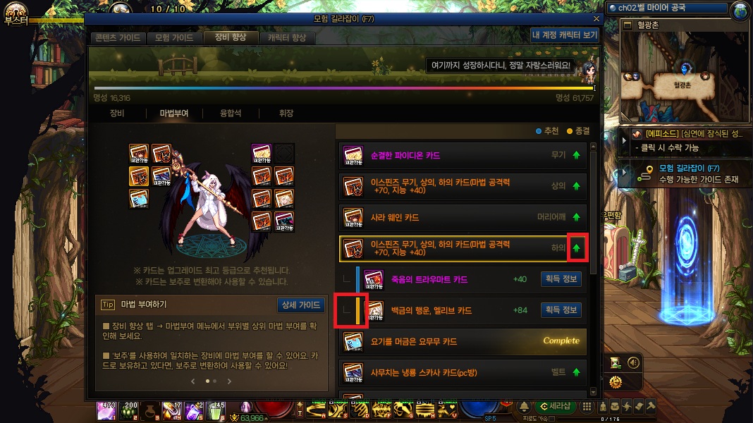 화면 우측 길라잡이 버튼 or F7키를 눌러 가이드를 켠 후, 위에서 "마법부여"탭에 들어가셔서 필요한 마법부여카드를 확인할 수 있습니다.