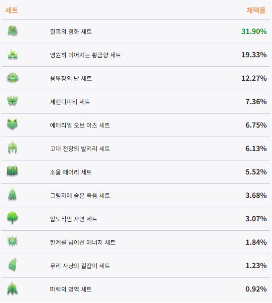 .남메카닉의 장비 세트 선호도입니다. 쿨감을 주는 칠흑이 가장 높은 것을 볼 수 있습니다.