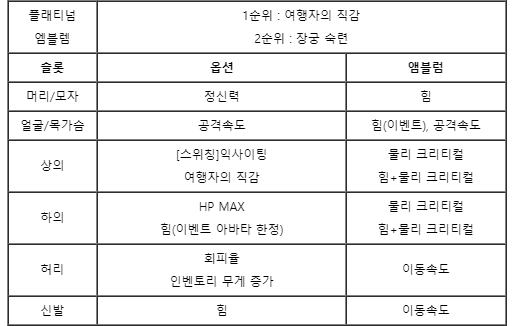 레어아바타의 경우 플티엠블 선택시 여행자의 직감이 비싸다면 장궁숙련도 선택지 입니다.