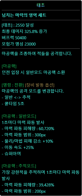 VP1은 연사수가 50%감소하고 시전시간동안 무적이 부여됩니다. 기존 탈리스만 옵션을 계승한 옵션으로