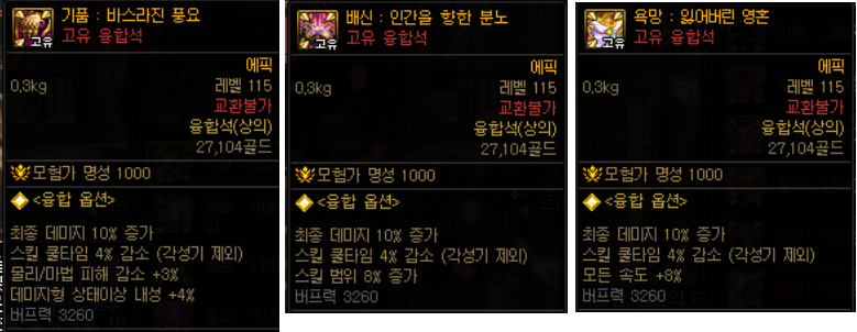 3가지 고유 융합석 중 자신에게 필요한 옵션(데미지감소/범위증가/속도)을 선택해서 가시면 됩니다.