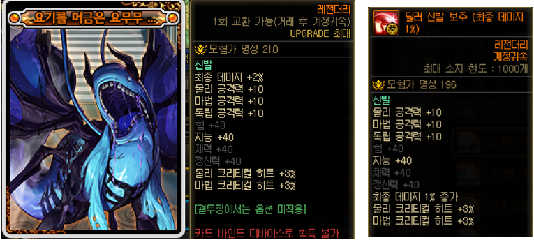 종결급 상/하의 옵션은 2% 최종데미지 옵션인데 베누스경매/카드 합성으로만 획득 할수 있기 때문에 가격대가 매우 높습니다.