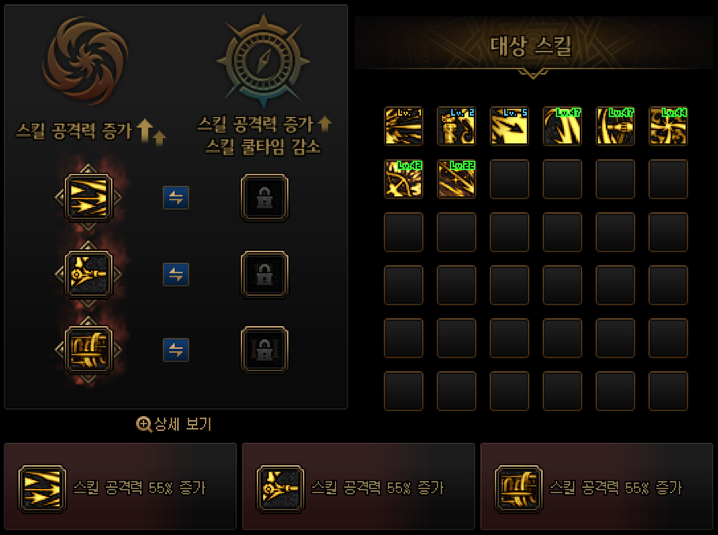 스킬강화는 본인에게 필요한 스킬을 큰폭의 데미지증가/소폭의 데미지 증가+쿨타임감소 2가지 옵션중에 선택해서 가주시면됩니다.