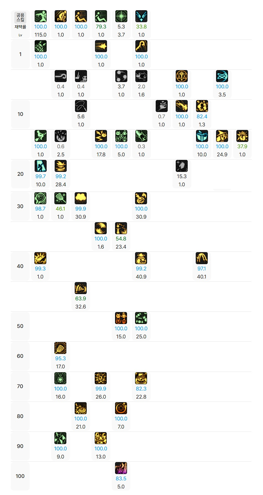 (1). 마스터 스킬: 채택률 98% 이상 마도 계열 스킬 (1Lv 마스터 스킬 및 선행 스킬 제외)