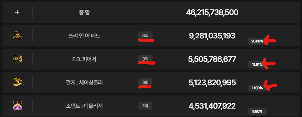 횟수랑 비중 보고 제일 높게 찍히는 걸로 몰아주시면 됩니다.