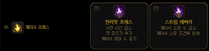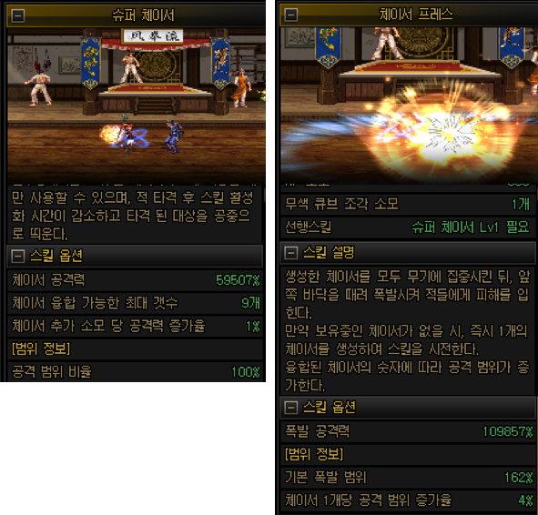 슈퍼체이서는 데미지강화/체이서 프레스는 범위증가효과를 받기때문에 되도록이면 슈퍼체이서에 체이서를 할당하는게 좋습니다.