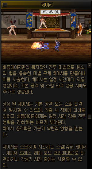 배틀메이지의 가장 큰 특징으로 체이서를 라는 자원을 수급/소모하여 공격하는 매커니즘을 가지고 있습니다.