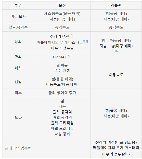 다만 특수장비 부위의 경우 종류 35~80제 + 단순범위증가 까지 그 종류가 매우 다양하고