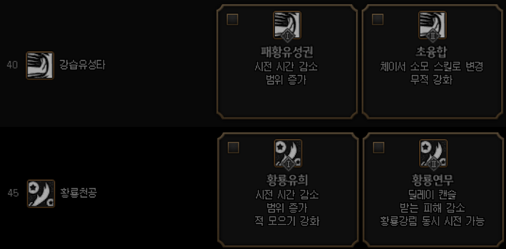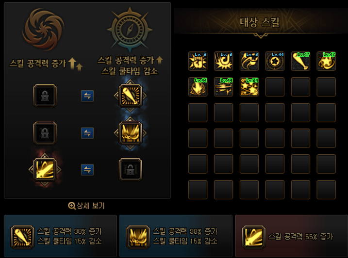스킬강화는 본인에게 필요한 스킬을 큰폭의 데미지증가/소폭의 데미지 증가+쿨타임감소 2가지 옵션중에 선택해서 가주시면됩니다.