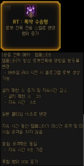 로봇이라는 이름의 폭발물을 설치, 전폭으로 폭파시켜 스킬 피해를 입히는 구조를 가진다.