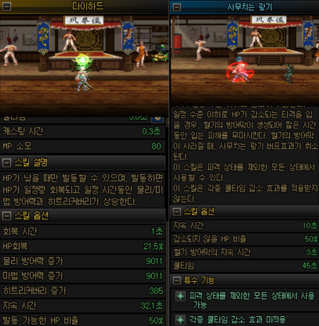 피가 50% 이하면 쓸 수 있는 약 20%를 회복하는 자힐기와 피격 상태를 제외하면 언제든(스킬 사용 중에도!) 발동이 가능한 무적기까지!
