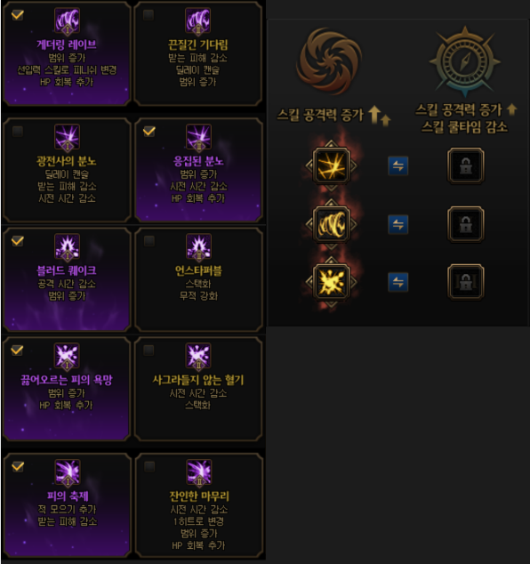 스킬 강화는 스펙이 좋은 블러드 붐브루탈 크러셔을 고정으로 마지막 한자리를 취향껏 선택할 수 있습니다.
