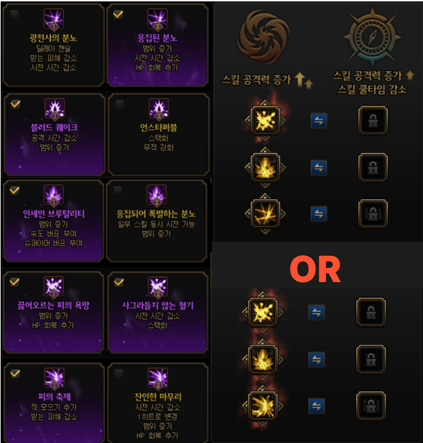 버프 강화는 '폭주', 딜플티는 보급형의 '갈증'/종결의 '혈십자'로 맞추면 됩니다.
