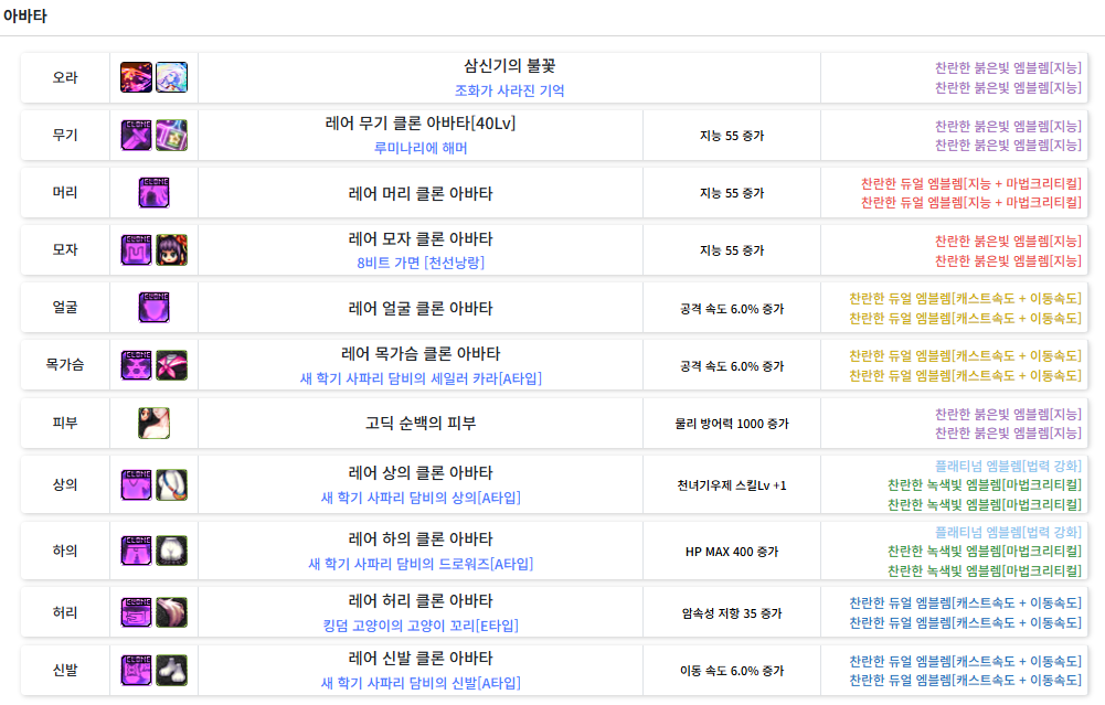 일반적인 마법딜러들과 큰 차이가 없는 아바타 세팅입니다. 유틸이 부족하기때문에 노랑, 파랑은 유틸을 꼭 채워주세요