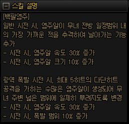 목환자경과 마찬가지로 기본에 충실한 스킬입니다. 생각보다 멀리나가기때문에 활용도가 매우 높습니다.