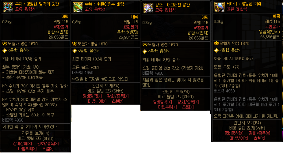 - 반지 : 고유:무지(회복력 원하는 일반유저 졸업템), 고유:축복(속도 챙기는 일반유저 졸업템), 고유:창조(쿨감 챙기는 일반유저 아이템), 고유:테아나(11증 이상 고증폭 졸업템)