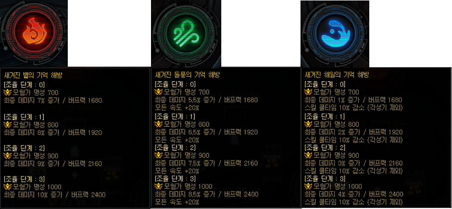 - 공통 : 볕(유틸이 남거나 랭커노릴 경우 선택), 돌풍(일반유저 선택), 해일(쿨감이 매우 부족할 경우만 선택)