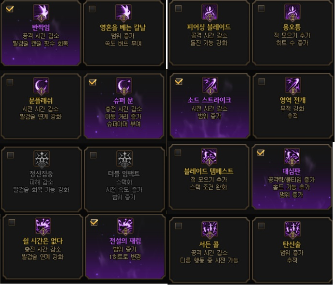 - 도, 소검 : 캔슬 스텍 회복보다 자체적으로 스킬범위 증가가 더 필요했음. 겸사 모션 빠른 것도 좋음.