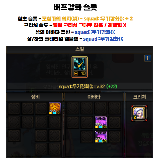 레어 무기 클론아바타의 경우 버퍼는 상대적 중요도가 떨어집니다만, 구비하시겠다면 스킬레벨은 어느것이던 상관없습니다.