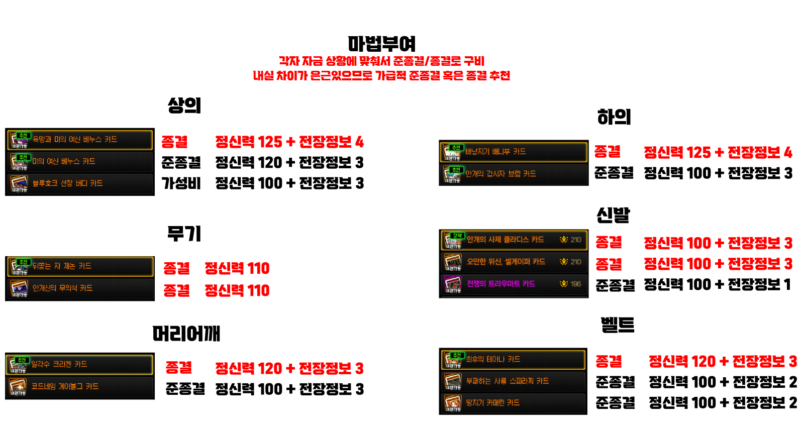 버퍼의 경우 마법부여 시 패시브 레벨이 붙어있어 생각보다 내실 차이가 꽤 나므로 준종결 이상을 추천드립니다.