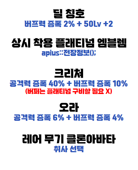 버퍼는 플래티넘은 칭호와 마찬가지로 필요없기때문에 아라드패스에서 받으시거나, 일반버전으로 구비하셔도 됩니다.