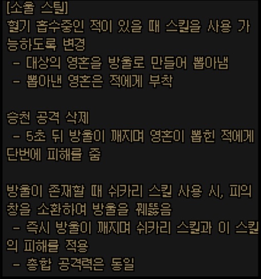 툴팁을 통해 알 수 있는 것처럼 블러드 소울 스틸을 사용하기 위해선 적한테 혈기 흡수를 적용시키고 있어야해요